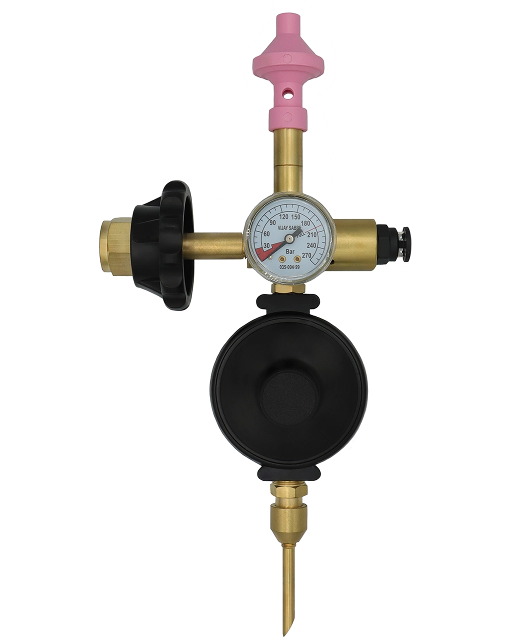 Wyposażony jest w manometr, co pozwala na kontrolę ilości gazu w butli.